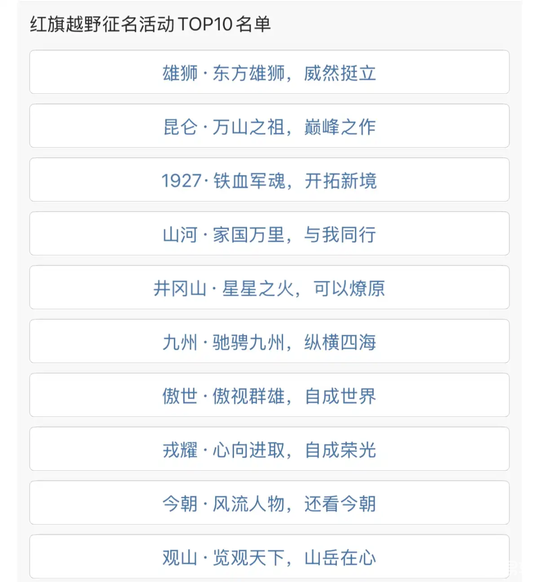 同时发布“红旗越野车名征集计划”。官方郑重承诺新车上市时,将向最终车名的建议者免费赠送“红旗越野”001号车。收到31万用户提供67245组命名方案(命名去重后数据),后经过重重关卡筛选,目前征名活动TOP10名单已经公布,最终命名将由大众投票而来。官方表示,投票时间为2025年10月8日-2025年10月31日。