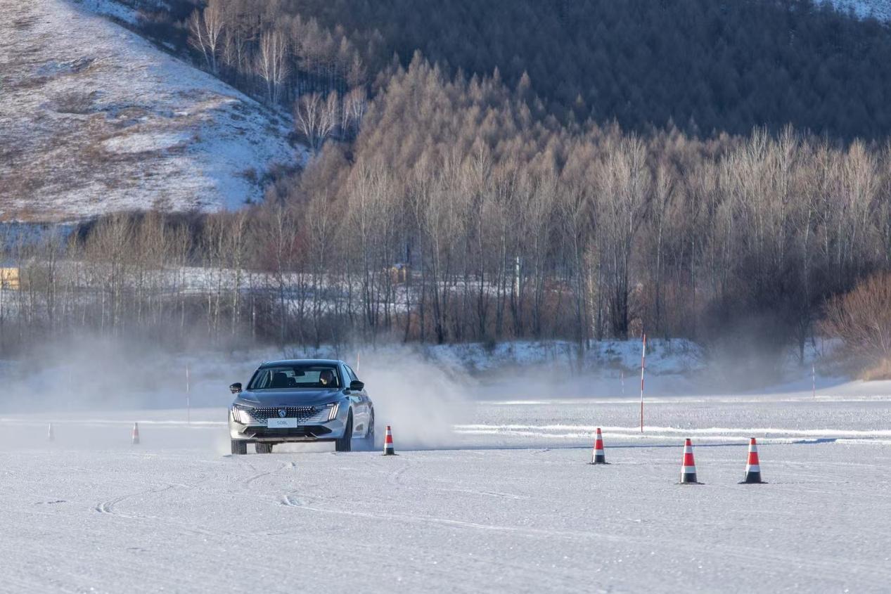 另一边的东风标致508L,则更像一位“灵动高手”,在连续避障和紧急避险中秀出了精准操控。在“雪地蛇形”测试中,508L以56.23km/h的平均车速、14.1秒用时顺利完成压实雪面的高速绕桩,展现了连续变线时的车身响应与循迹稳定性。更值得一提的是“雪地双移线”测试,模拟“鬼探头”等突发路况,车辆在不进行油门或制动操作的情况下,仅凭转向完成避障,508L以77.19km/h的入桩速度稳定通过,这对其操控极限和车身控制提出了严苛要求。