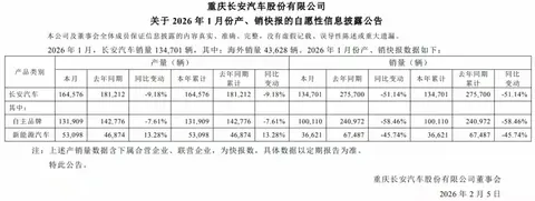 2月4日,国内自主五虎之一长安最后一个发布销量快报。