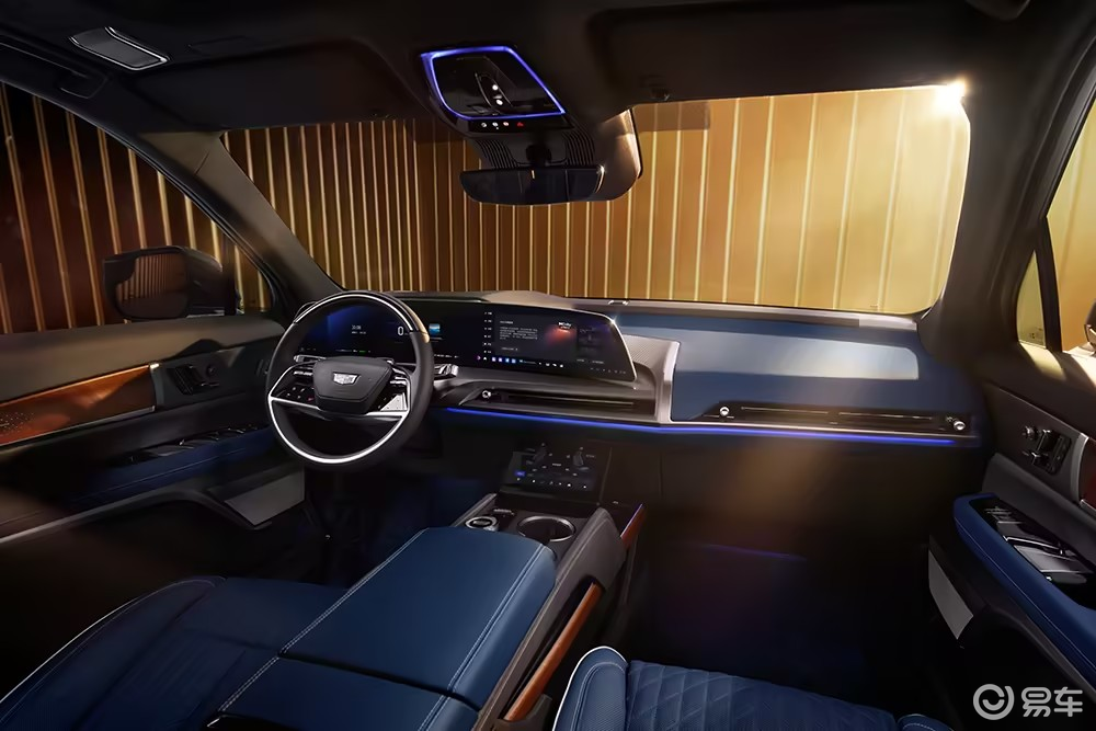 从官方发布的内饰图来看,凯威德延续了凯迪拉克近几年电动车的设计思路,中控区域最醒目的依旧是一块 33 英寸环幕式 9K 曲面屏,从仪表区域一路延伸到中控,视觉冲击力比较强。