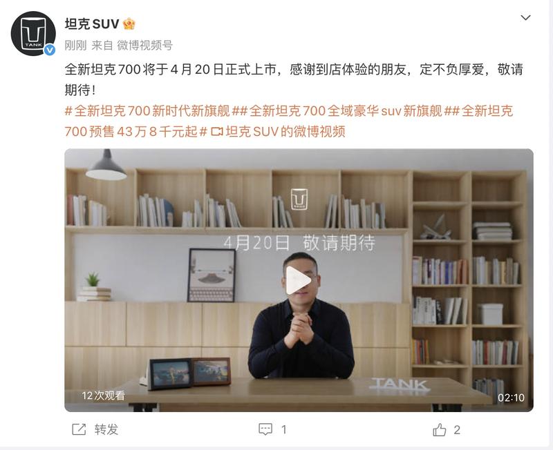 车讯 4月8日,坦克品牌宣布全新坦克700将于4月20日上市。全新坦克700已在3月30日开启预售,预售价区间43.8-51.8万元。