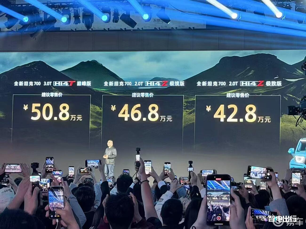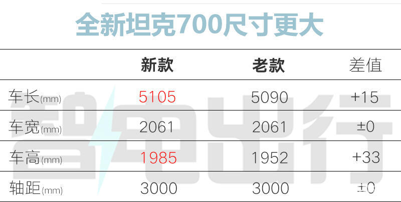 4月20日,全新坦克700正式上市,指导价42.8万-50.8万元,相比预售价全系降了1万元。和老款相比,新车在尺寸、动力、配置及设计上均有调整。