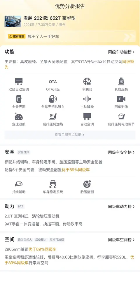 2021款的车,配置也不会差,君越 2021款 652T 豪华型配备了全车无钥匙进入和启动、定速巡航、倒车影像、全景天窗、真皮座椅等配置,其中双区自动空调同级领先。