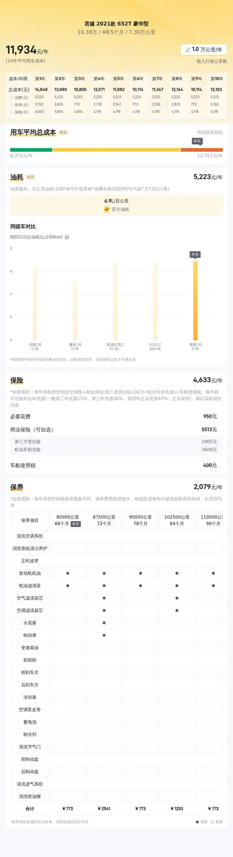 据估算,同级车的最低用车成本是6505元/年,最高是14793元/年,君越 2021款 652T 豪华型是12568元/年,所以用车成本不算低。