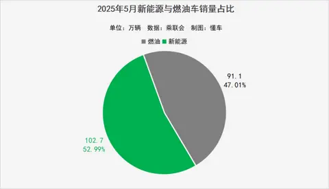 新能源方面,5月新能源销量为102.7辆,比燃油车多了11.6万辆,新能源渗透率为52.99%。